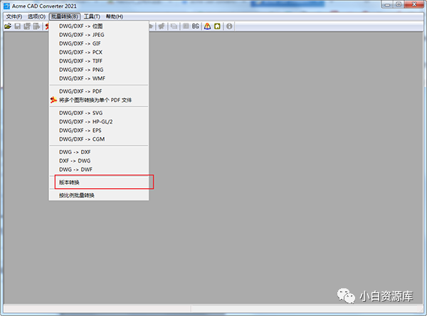 2、我们点击功能栏上的“批量转换”按钮,在呼出的选项中选择“版本转换”;
