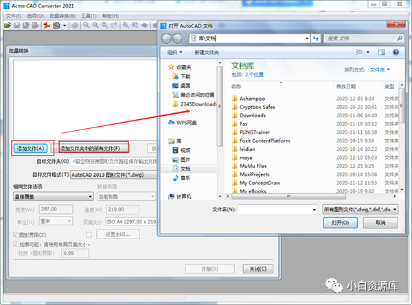 4、我们点击“增加文件”或者“添加目录中的图形文件”按钮,在呼出的打开窗口中选择autocad文件;