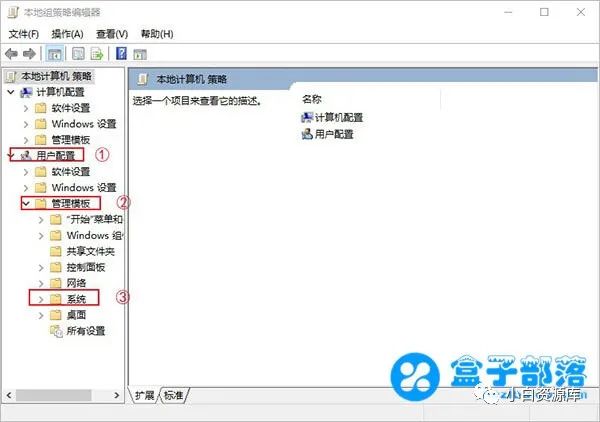 2. 点击展开用户配置,点击展开管理模板,点击展开系统;