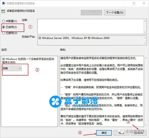 4.点击选择 已启用 ,展开选择 忽略, 点击应用,点击确定退出;