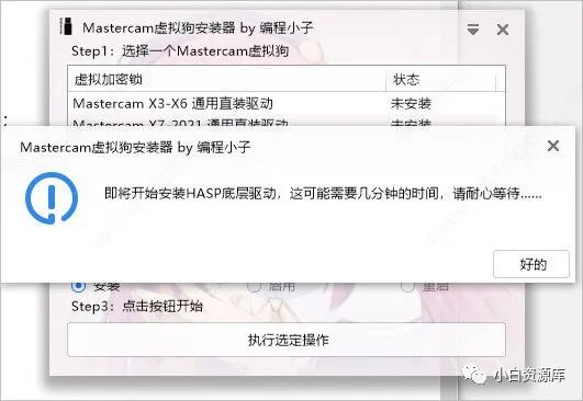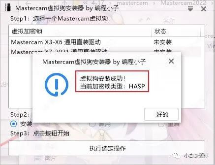 11.第二步:双击运行"Mastercam Virtural Key Installer.exe"程序,选择X7-2021直装驱动(2022可用),选择安装, 点击执行选定操作;