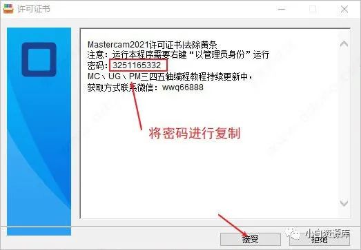 14.第三步:以管理员的身份运行"Mastercam去除黄条 右键以管理员身份运行.exe"程序,将密码复制下来,点击接受;