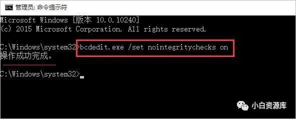 然后把bcdedit.exe set nointegritychecks on复制到命令窗口,按回车执行即可。