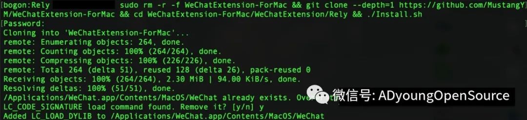 sudo rm -r -f WeChatExtension-ForMac && git clone --depth=1 https://github.com/MustangYM/WeChatExtension-ForMac && cd WeChatExtension-ForMac/WeChatExtension/Rely && ./Install.sh