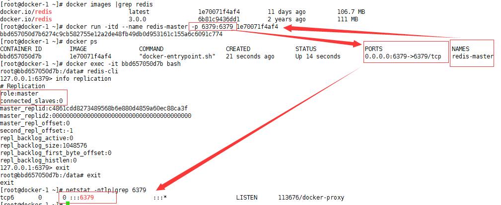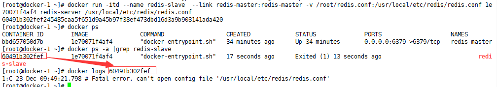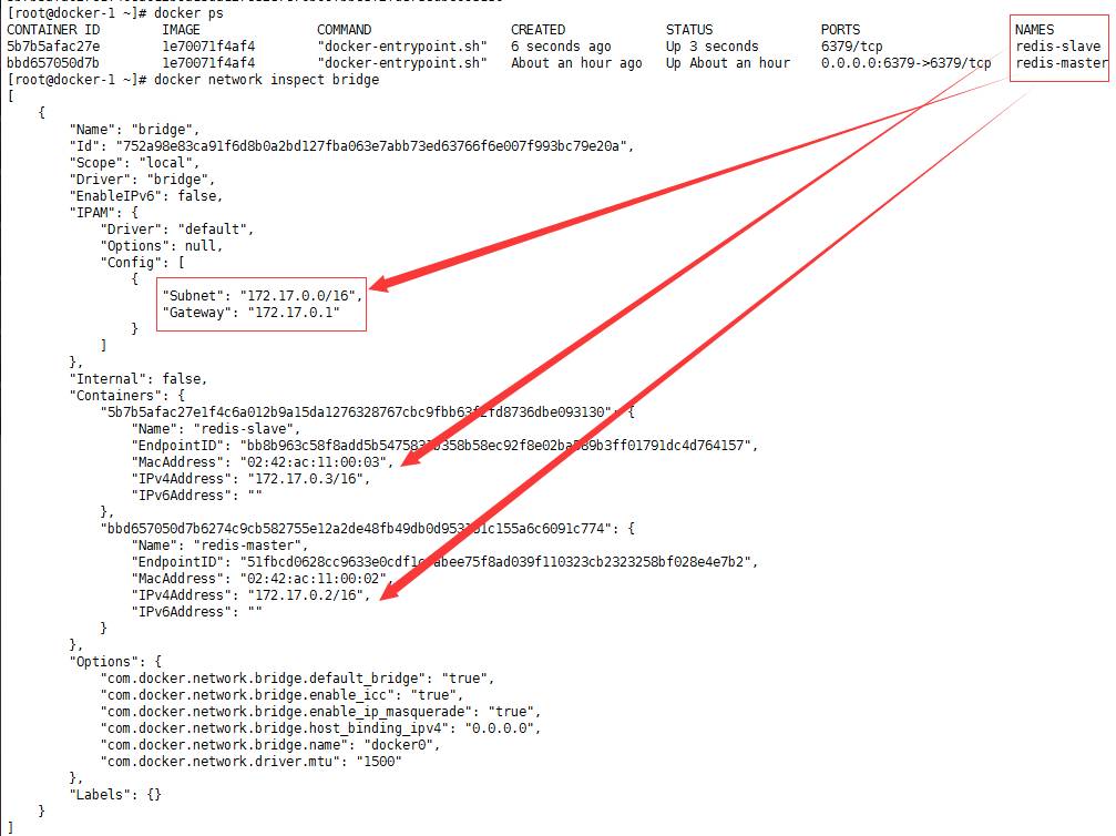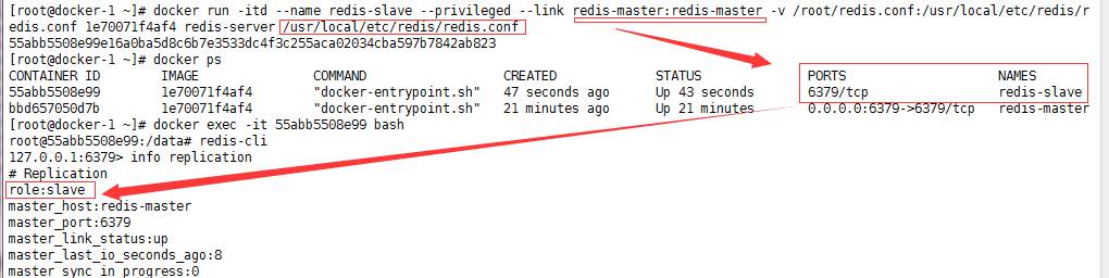 在此处需要注意的是,两个docker默认都是使用桥接模式,也就是使用的是docker0的桥,从而都会分配IP地址,在使用--link的时候,主要是为了从容器里面能够直接解析这个主机名,不需要在配置文件写上ip地址,由于是使用的自定义的配置文件,从而需要将本地的配置文件进行挂载上去,也就是-v参数的作用,将这个配置文件挂载到redis服务器,然后使用这个配置文件启动这个容器。