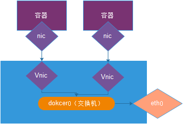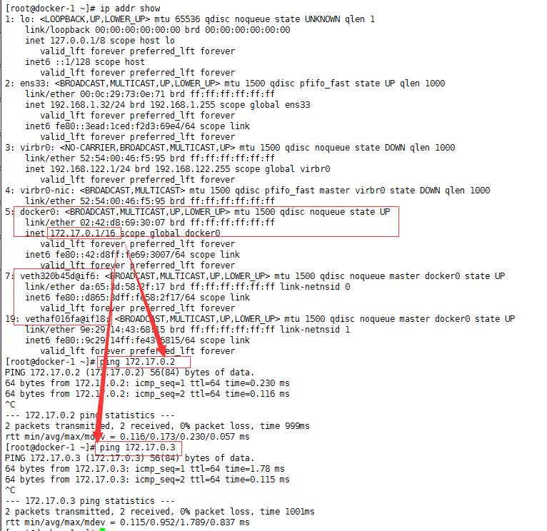 这个可以从物理主机上看见两个虚拟的网卡,其实也就是和容器的网卡对应的,docker0桥接的相当于一个虚拟的交换机,从而容器之间能相互通信,和物理主机也能进行通信,如下所示:
