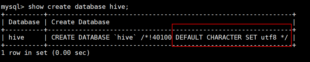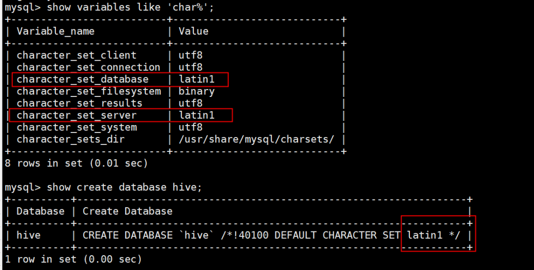 //修改mysql的配置文件my.cnf,在mysqld的配置下加上字符编码为utf8[root@KEL1 ~]# diff etc/my.cnf etc/my.cnf.bak28,32d27< character-set-server=utf8< [client]< default-character-set=utf8< [mysql]< default-character-set=utf8//重启mysqld进程[root@KEL1 ~]# systemctl restart mysqld//检查配置是否生效mysql> show variables like 'char%';+--------------------------+----------------------------+| Variable_name | Value |+--------------------------+----------------------------+| character_set_client | utf8 || character_set_connection | utf8 || character_set_database | utf8 || character_set_filesystem | binary || character_set_results | utf8 || character_set_server | utf8 || character_set_system | utf8 || character_sets_dir | usr/share/mysql/charsets/ |+--------------------------+----------------------------+8 rows in set (0.01 sec)//删除hive的元数据库,进行重新初始化mysql> drop database hive;Query OK, 53 rows affected (0.12 sec)