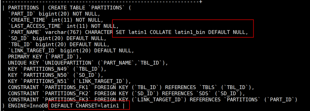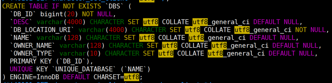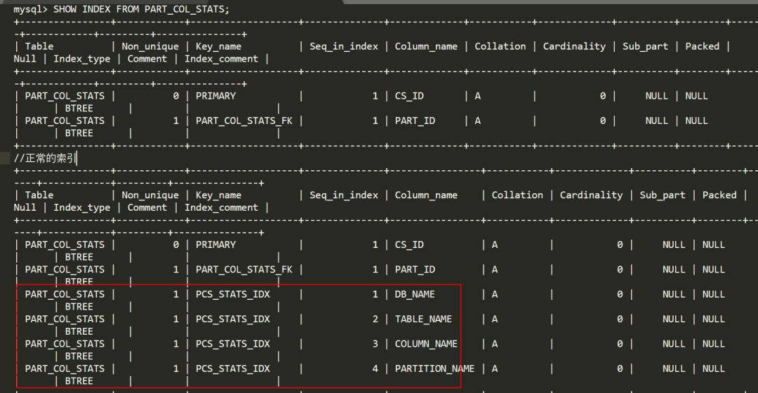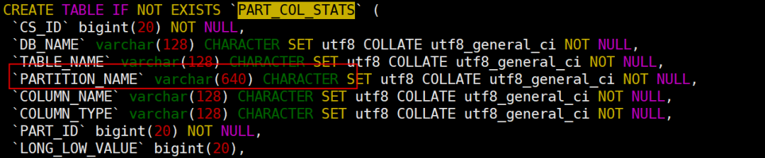 //组成索引列总长度大于3072 bytes时报错CREATE INDEX PCS_STATS_IDX ON PART_COL_STATS (DB_NAME,TABLE_NAME,COLUMN_NAME,PARTITION_NAME) USING BTREE;