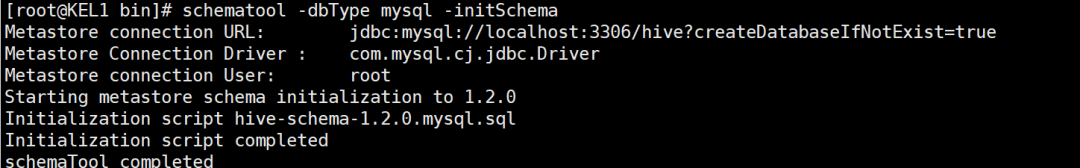 [root@KEL1 bin]# schematool -dbType mysql -initSchemaMetastore connection URL: jdbc:mysql://localhost:3306/hive?createDatabaseIfNotExist=trueMetastore Connection Driver : com.mysql.cj.jdbc.DriverMetastore connection User: rootStarting metastore schema initialization to 1.2.0Initialization script hive-schema-1.2.0.mysql.sqlInitialization script completedschemaTool completed