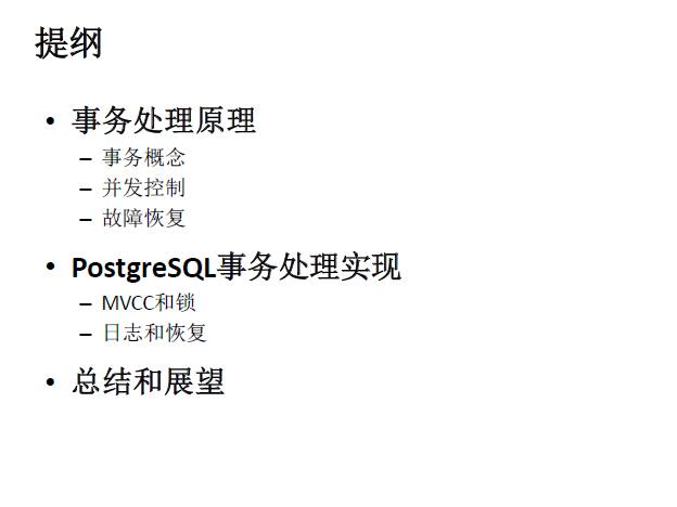我今天的演讲叫数据库事务处理的原理和实例剖析。共分为三部分:事务处理的原理,PostgreSQL的事务处理机制剖析,和一个简单的总结和展望。