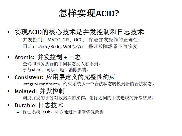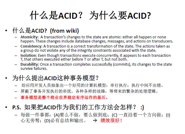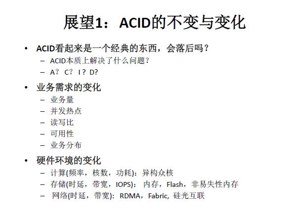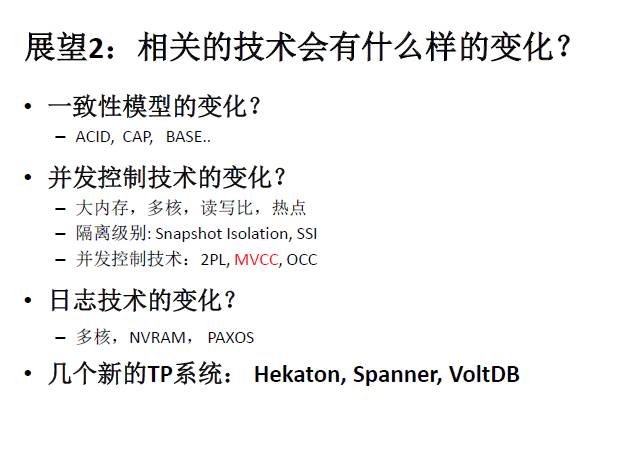 下面是一个简单的总结和展望。展望部分,主要考虑几个问题:(1)ACID有哪些不变和变化?(2)业务特征的变化,硬件的变化,对事务处理提出了什么样的要求?(3)随着这些趋势,相关的支撑事务处理的技术有哪些变化?(4)最近出现的三个新的事务处理系统,Hekaton, Spanner, VoltDB, 各自有什么样的考虑和特点?