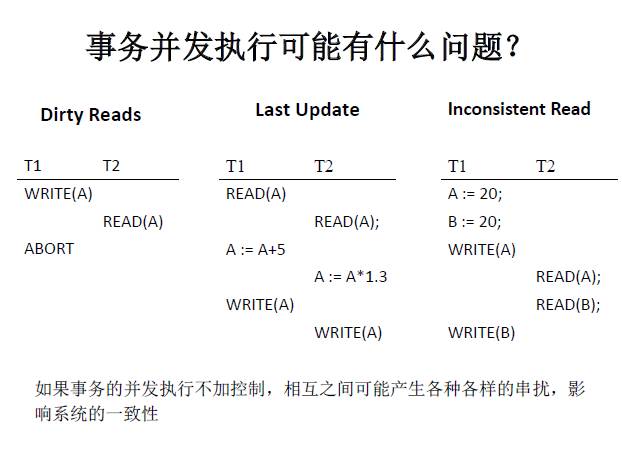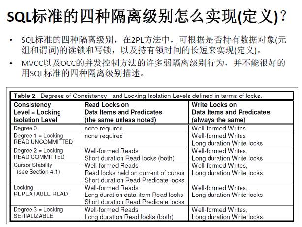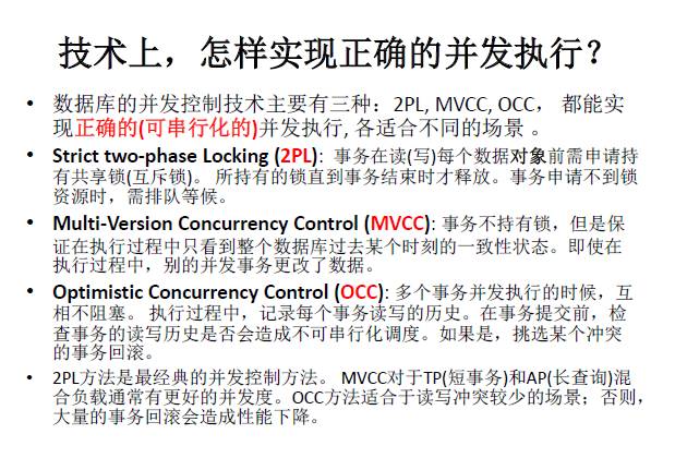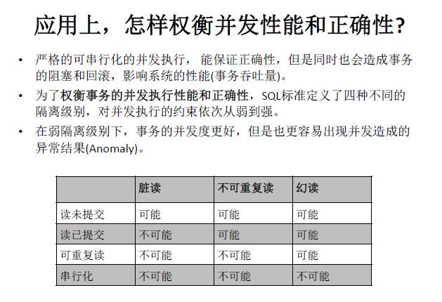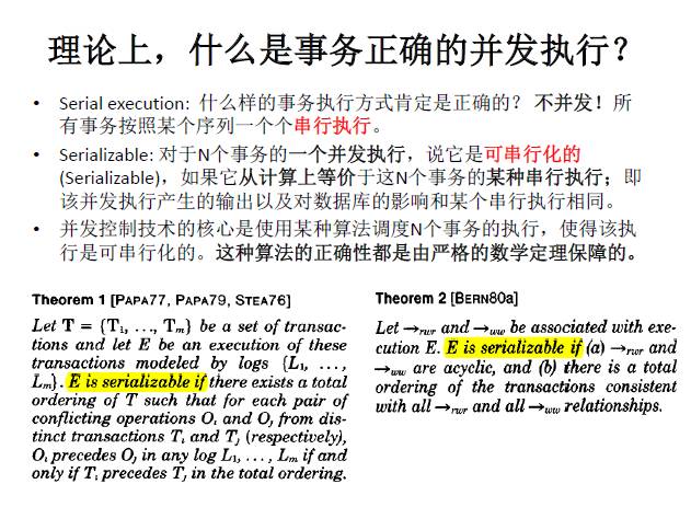 主要包括几个问题:(1)事务并发执行可能有什么问题?(2)理论上,什么是正确的并发执行?(3)在内核技术上,怎样实现正确的并发执行?(4)在实际的应用过程中,为了获取应用的性能,往往会提出一些弱的,可能存在并发问题, 但是性能更高的隔离级别,这些隔离级别是什么样的? 怎样定义和实现?