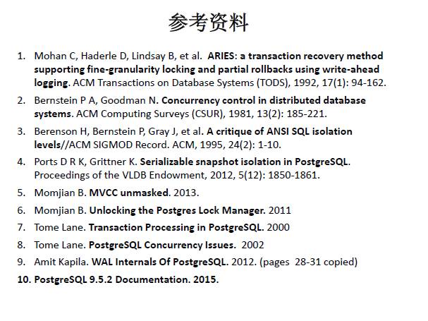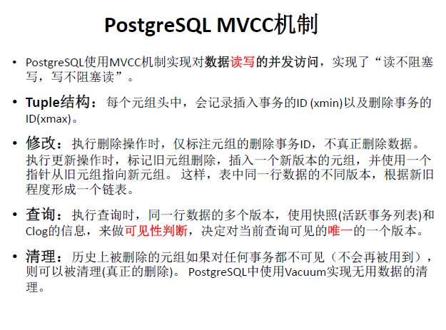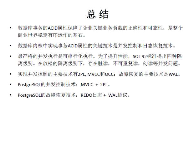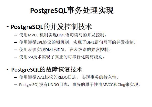 主要包括几个方面:(1)PostgreSQL的并发控制技术。(2)PostgreSQL的故障恢复技术。