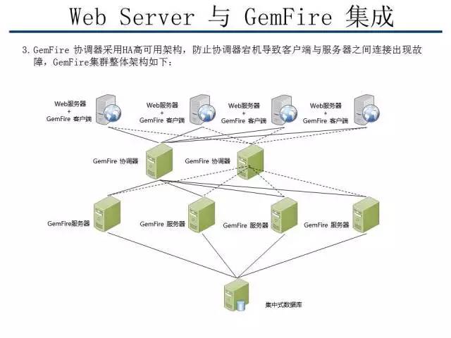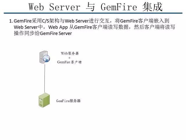 目前 GemFire 与Web Server已经做了很深的集成,将GemFire客户端嵌入到Web server当中,Web Server从GemFire客户端读写数据再同步给GemFire Server。