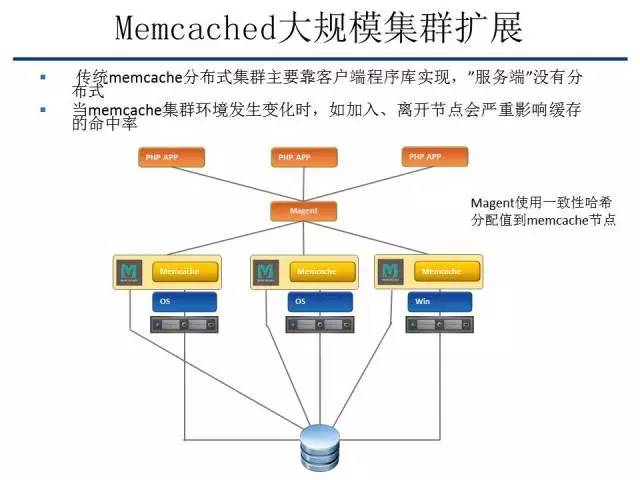 Memcached整个集群的扩展有一个标准,Magent利用一致性hash分配值到Memcached节点,进而告诉前端应用把数据存到哪。这样会出现一个问题,它并没有服务端的分布式,只是一个伪分布式,不能达到完全分布式。如果集群动态添加节点的话,会严重影响缓存命中率。