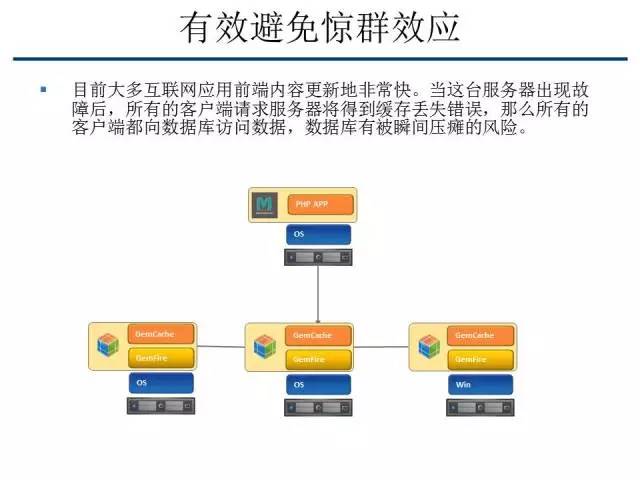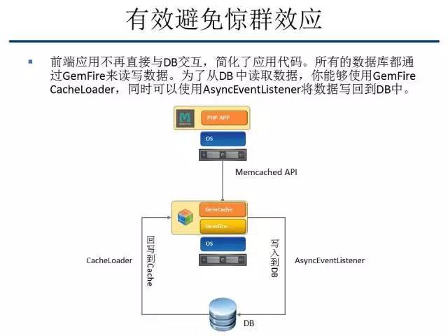 如果用Gemcached构建后端分布式集群的话,前面的应用都不用改,直接访问Gemcached就行。后端的数据保存都可以用GemFire整体的Cache Server来做,它也有分布式事务,分布式锁。后端不挂DB也没问题,挂DB也没问题。