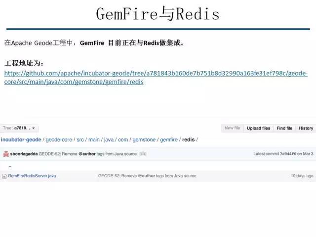 至于二者的关系,也并不是替代关系。Redis可以作为GemFire的一个缓存,Redis在前,GemFire在后,最后可以做一个MySQL集群,这样做成一个大的并发访问,页面或评论。GemFire也可以作为Redis的数据缓存,如果要存内存模式,没有数据可以到GemFire取,GireFire把数据推给Redis。写redis的话,也有一些写好的版本(链接如上图所示),可以在此基础上,稍作修改。