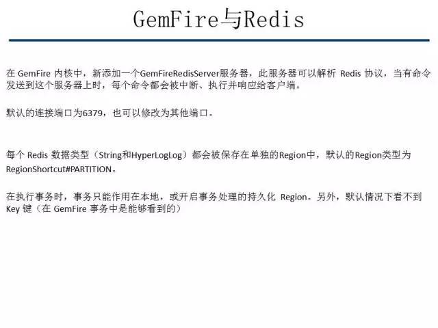 因为近几年Redis比较火,所以去年开始,GemFire就开始对Reids做集成,它也采用接管Reids客户端的方式,直接接管Reids操作,不需要对服务器进行操作,还是什么简便的。