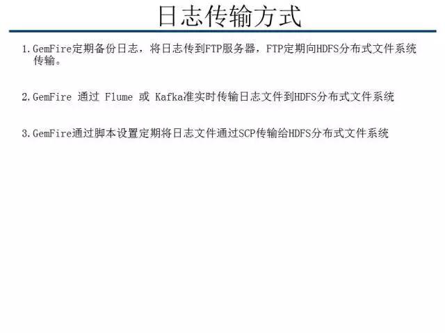 GemFire日志里有很多挖掘,在具体应用上比如银行,它把很多交易数据写到日志中便于分析挖掘。同时GemFire自身的运行数据写到HDFS里,上端用Hadoop进行挖掘分析,GemFire集群出现任何问题都可以及时发现,数据本身出现的问题,也可以分析出来。不仅是IC层面,最终达到运营体系架构的支撑。如果需要使用前端的PV点击,也可以通过GemFire传数据。
