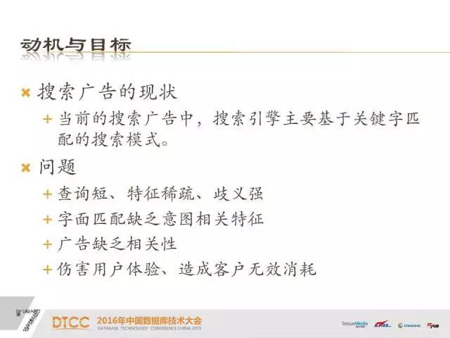 先讲一下动机和目标,现在的搜索广告主要是基于查询词和广告关键词匹配的搜索模式,这在学术上就会引出一些问题,无论是常用词还是关键词,在学术上来说都属于短文本,由于短文本的特性,处理它时可能会有一些问题。短文本含词较少,一般就两三个,文本处理特征非常稀疏,还有一个问题就是歧义强。由于字面匹配方法缺乏意图相关的特征,所以这时如果仅用文本匹配,就会导致很多广告缺乏相关性。基于关键字匹配的搜索方式常常忽略了对查询背后用户真正意图的识别,这时就会对用户造成不便。比如现在我想要查一个游戏电脑,结果出了一个电脑游戏,这会伤害用户的搜索体验,造成对客户无效消耗,还会浪费我们自己的广告位,引起用户和客户对我们技术能力的质疑。