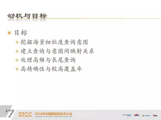 我们的目标就是能够使用海量用户搜索日志,在海量数据里挖掘潜藏的查询之间的结构信息,然后再找到查询聚类。高频查询已经可以通过一定的结构体系识别意图,然后建立长尾查询到意图之间的映射关系,这样就可以处理高频和长尾查询了。