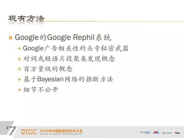 这是Google的Google Rephil系统,号称Google广告相关性的头号秘密武器,其实我们的思路基本一样,但技术手段实现上面差别很大,Google系统是不对外公开内容的,但通过研读发明人的博士论文背景和宣传的只言片语,其实可以知道一些大致的行为。描述该系统最详细的一本书是谷歌凯文墨菲的《机器学习概率观点》,其中讲到该系统基于贝叶斯网络的Rephil的系统,基本理论应该是通过查询词或谷歌广告关键词的同现关系,对词或短语片段进行聚类,但该聚类也是基于贝叶斯网络的聚类,然后聚类出百万量级的概念,相当于每个聚类称为一个概念,然后再用一个有监督的方法发现这些概念,可以根据用户的实际查询发现这个百万量级的概念。