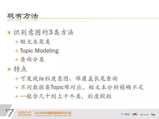 学术界识别用户查询意图方法主要分为三类,一类是短文本聚类,这个方法主要就是为了发现高频意图,谷歌曾用它做意图发现,并把这种查询和点击的关系做了出来,上面是用一个马尔可夫模型做的聚类,最重要的好处是该方法可以发现很细的用户类查询,但缺乏一个有监督的方法,很难覆盖到长尾查询。