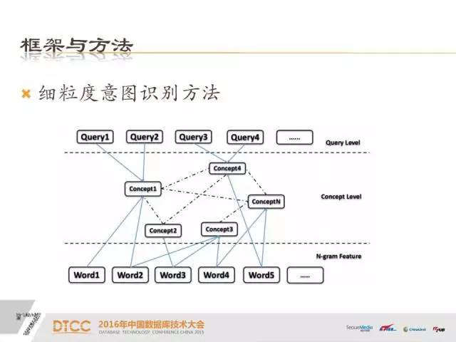 下面就是我们的框架,主要分为三层,上层是query层,我们会通过无监督的聚类方法,把query聚在一个个concept上,这种concept实际上就是概念,它的粒度实际上非常小。