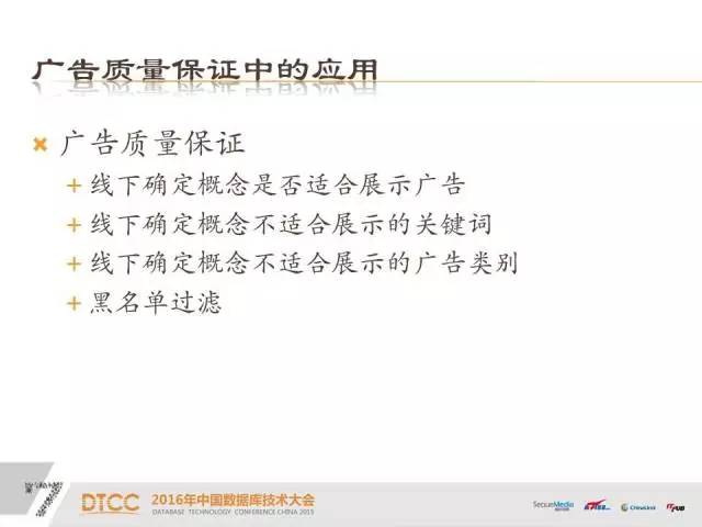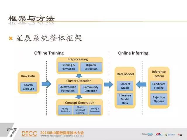 我们把它分成两部分,一是线下训练阶段,主要分为三块,一是抽取当中的结构关系进行预处理,然后基于网络挖掘算法进行挖掘,精度不够人工也修不过来。后面还有一个概念生成,通过算法扔掉检测出来的不好的东西,用文本特征生成这些概念和线上推断模型,线上推断系统分成两步,第一步是相关概念,最重要的一步是需要推断它的概念是不是达到了足够的精度。如果精度不够,我们就会拒绝这个概念的选择,这样实际上是通过牺牲一定的覆盖率,来达到非常高的精确性。