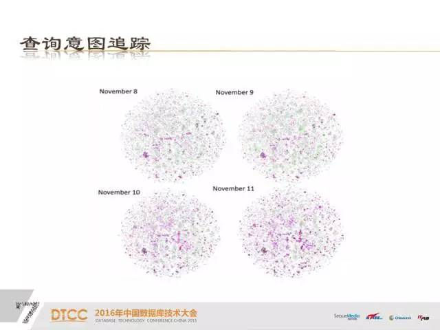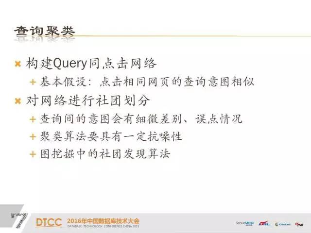 实际上我们用的是年级别的查询同点击数据,用到了查询的同现建立一个复杂网络,我们在这个网络上进行聚类,我们聚类用到了图挖掘中的一类方法——社团发现。由于数据规模非常大,所以在网络中查询会有一些细微的噪声,我们希望我们的方法具备一定的抗噪性,经过对比我们了选择近十年出现的最新发现算法——社团发现。