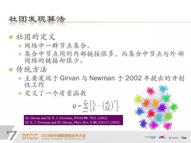社团就是网络中的一群节点,我们用不同的颜色表示不同的社团,这种聚类就是所谓的社团,它的特点就是内部连接的边非常多,但外围连接的边相对较少。实际上图切分问题由来已久,在机器学习领域里面,很早就有人提出基于图的谱切分方法,但我们通过对比发现2008年Newman教授开创的社团发现或者说是图切分算法的分支,效果最好。因为实际网络中,聚类并不是一个呈正态分布的问题,而是极少的聚类非常大,并且绝大多数都是聚类,个数非常多,但所含的节点很少。传统的聚类方法往往倾向于对网络过往不断的进行二分,所以对均质网络的处理上噪声会非常大,通过实际对比,我们最终还是选择了Newman的切分算法。