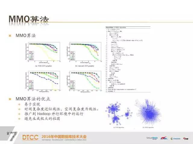 这个质量函数并不是越优越好,它存在一个问题,它更倾向于把小社团合并在一起成为一个大社团,从而造成Q的质量上升,。为了处理这个问题,我们在这一组算法中提出了修改,设计了一个MMO模型,叫多模块优化算法,它是一个线性迭代算法,用时间复杂度和整个网络的大小,乘上前面的迭代次数就可以了。存储的空间复杂度也只需要存储一个聚类的结果,以及整个网络的大小,这个算法适合于现实数据中上千万的节点和上亿条边的处理。