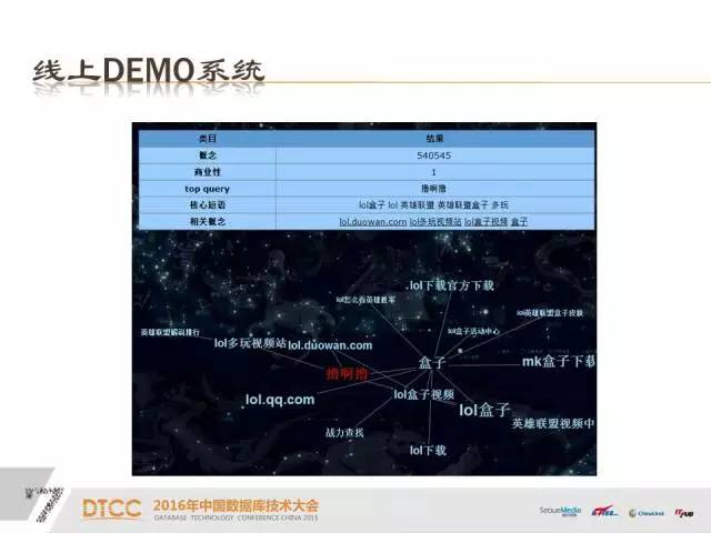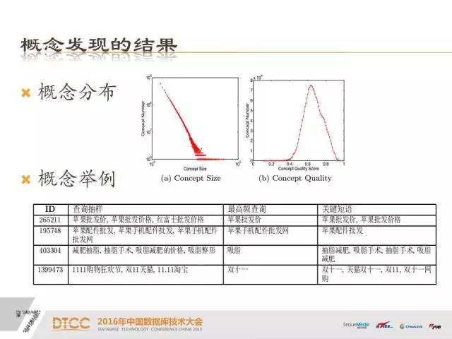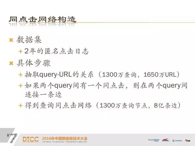 我们会处理两年的匿名点击日志,具体处理方法是抽取当中的query-URL关系,它的规模是千万量级的query,如果存在点击关系就在当中建立一条边,产生一个query图,这个图的结构非常复杂,借助上面提出的MMO模型,挖出查询日志的concept,然后进行聚类,我们算法处理的规模是1300万个节点,8亿条边。