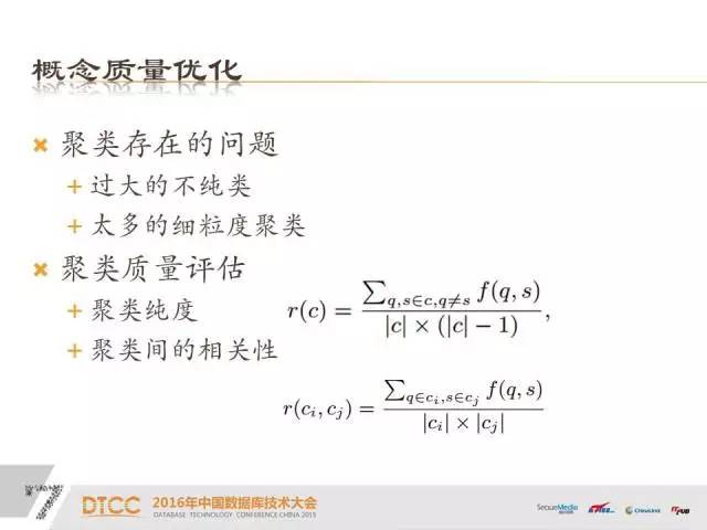 聚类出来以后还需要修正一下,因为再好的算法还是会造成不如意的结果,所以我们要处理两个问题,一是太大不纯的聚类,我们需要衡量质量度,如果质量度过低的话,我们会对它进行再次切分,如果有一些切得过细的聚类,就要重新合并,所以我们提出两个质量,一是衡量单个聚类的质量,上图中的f是文本相关性函数,也就是说质量越高这个社团越接近于我们认为的概念,还有一个是度量社团之间的相关性。