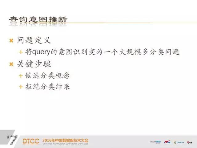 模型选好以后,我们会扔掉质量差的聚类,质量太差或者太大的再次进行切分,我们再找到各个聚类,我们就把它叫做意图概念,大概是200万的级别,然后在这种概念的query出来以后,接下来的任务就是把它分配到概念当中,找出一个最相关的。或者直接拒绝掉无法判定,下面分成两部分,一部分就是找出候选的分类概念,还有一个就是要确定是不是达到了一定的精度。