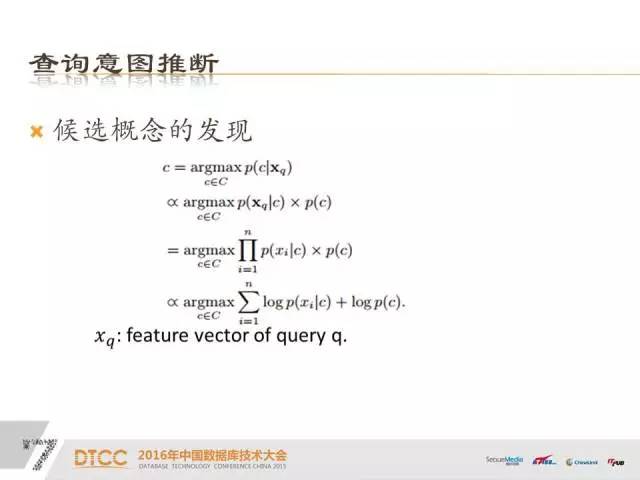 下面是给定了query的一个特征向量Xq,我们希望找到Xq条件概率下的concept,然后用贝叶斯假设把它展开,因为在实际运算中,我们的量会很大,统计的概率一定会非常低,会造成浮点溢出,所以在实际应用中会对它进行log运算。我们认为最后一步加和的分数越大,概念越相关。