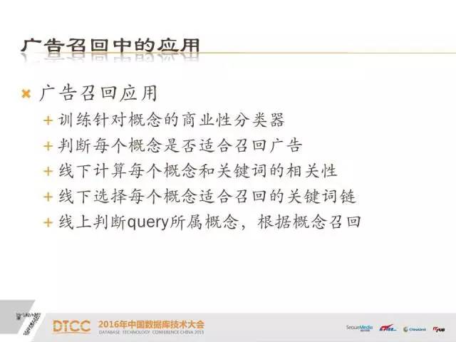 对于其在广告召回中的应用,它可以训练针对概念的商业性分类器,判断每个概念是否适合召回广告,线下计算每个概念和关键词的相关性,线下选择每个概念适合召回的关键词链,线上判断query所属概念,根据概念召回。