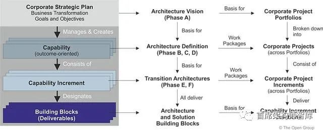 上面的图表显示了业务能力和能力增量之间的关系,并且还与企业架构开发方法阶段以及计划和项目组合的工作包的定义相关。