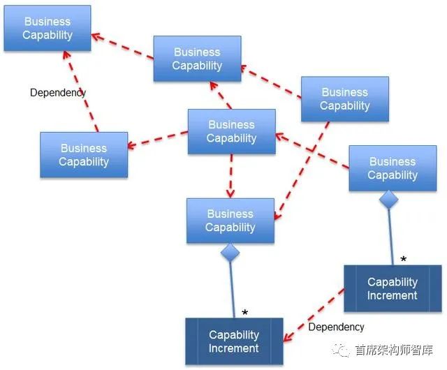 上面的图表显示了业务能力之间以及能力增量之间的依赖关系。