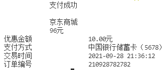 print("支付方式\t\t中国银行储蓄卡(5678)")