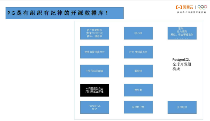 PG是有组织、有纪律的开源数据库,有专门负责筹款、基金管理的准则,也有负责生成行为准则的委员会和负责赞助商管理的委员会。正因为有组织、有纪律,PG才能经久不衰。