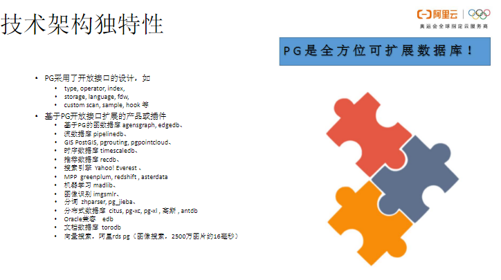 PG具有非常独特的技术架构,允许拓展新的数据类型,PG 12甚至开放了存储接口的后台,可以增加行列混合存储等。此外,PG还可以扩展编程语言。此外,还有扩展出很多衍生的数据库或者插件。因此,PG是一个可以真正做到全方位扩展的数据库,用户可以直接使用,当用户觉得无法满足业务需求时也可以扩展,而扩展未必需要自己实现,可以在社区里面寻找相应插件。