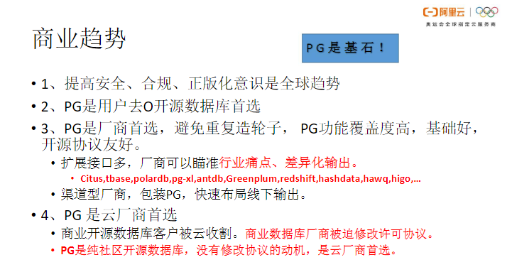 目前,提高正版化、安全、合规等意识已经成为一个全球趋势。而PG因为它的开源协议,成为了一个很好的选择。并且PG的稳定性和可靠性也非常优秀,能够很好地兼容Oracle数据库,因此将会成为企业“去O”的首选。