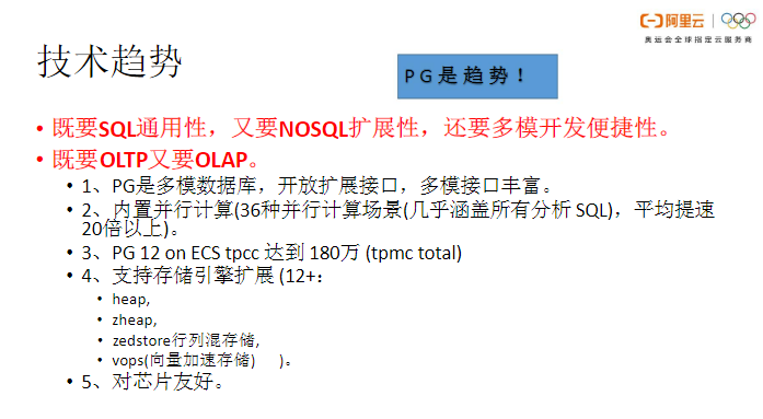 同时,PG也是未来的技术趋势。如今,业务对数据库的要求越来越高,不仅需要存储关系型数据,也可能需要存储多模数据。基于PG的可扩展性,可以扩展出各种功能,既能够满足SQL的通用性,又能够满足NoSQL的扩展性,同时还具有多模开发的便捷性。