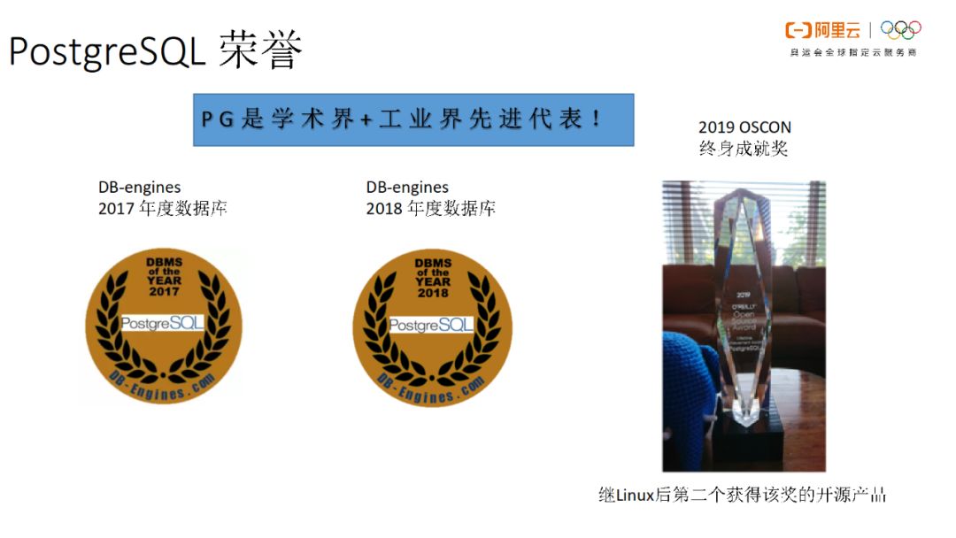 PG获得了DB-engines 2017和2018年的年度数据库,并且在2019年获得OSCON终身成就奖,成为了Linux后第二个获得该奖的开源产品。