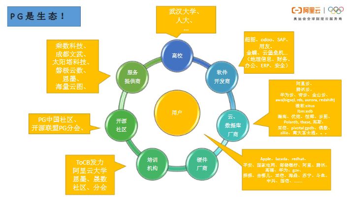 PG的生态非常完善,从用户、高校、软件开发商、云厂商、服务提供商、开源社区、培训机构到硬件厂商,整个生态一应俱全。