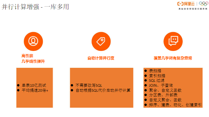 自动并行计算不需要改写SQL,而是根据SQL代价自动规划并行数量,并且能够覆盖几乎所有复杂查询。