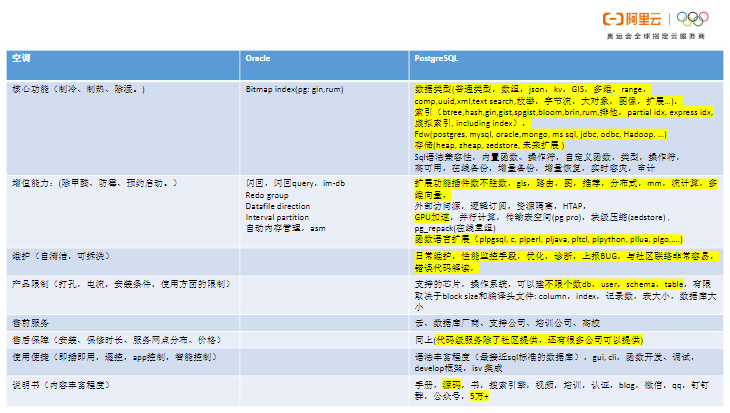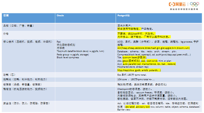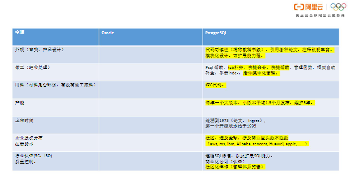 最后将PG和Oracle做一个全方位对比。就像是双11购买空调一样,我们需要精心对比一下。首先,从口碑和版本的发布节奏来看, PG一定稳赢。以下几张图中标黄的部分是具有的优势。其中,价格很明显不用比,因为PG“不要钱”。在核心技术方面,Oracle具有Rac,比原生PG强。但是PG的生态非常强大,用整个生态去PK Oracle,输赢就不好说了。在优化器方面,Oracle确实做得特别好。对于内存表而言,PG表空间对应到文件系统,一个文件一个表空间。而Oracle通过datafile加进去,可以理解为在多个block devs上面组合出一个大表空间,在这个大表空间里面可以横向去扩展对象。而PG如果想要整出一个特别大的表空间则需要借助存储的能力或文件系统的能力。