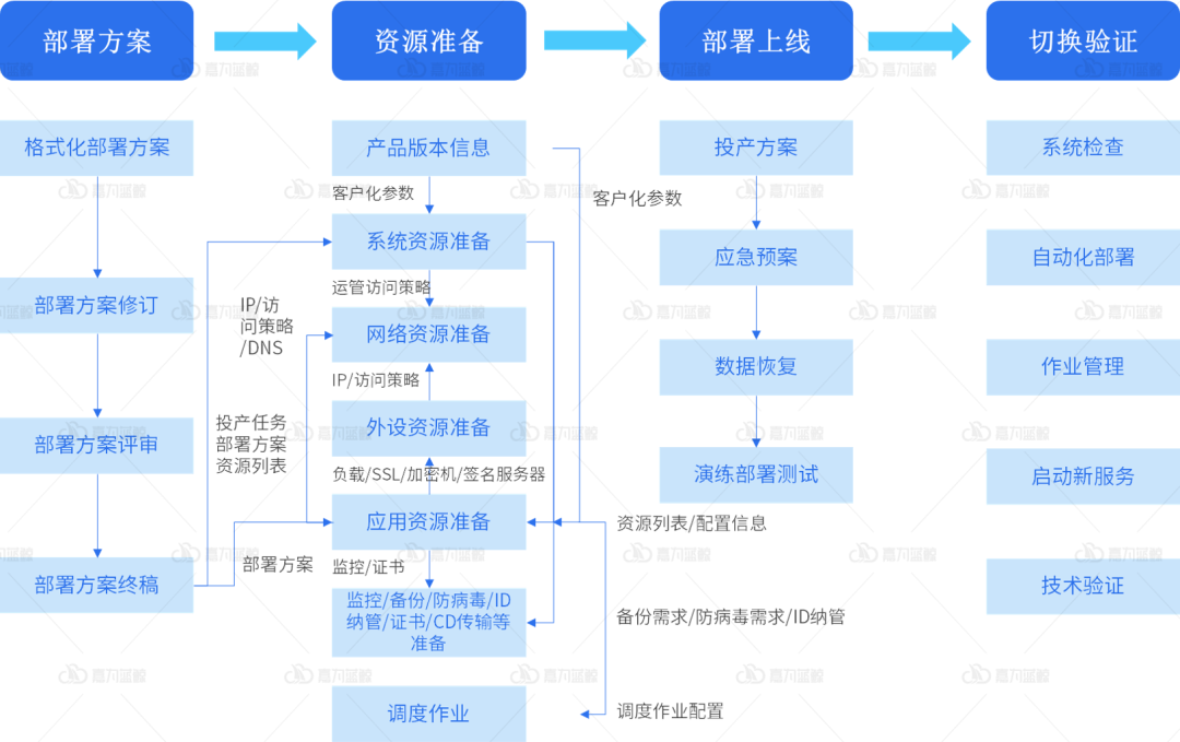 每个环节涉及不同的子任务,例如部署方案制定阶段包括:在线编制结构化部署方案、部署方案修订、部署方案评审、部署方案终稿等过程;而资源准备过程又包括从产品版本信息到调度作业配置的完整过程。各个阶段之间,不仅有操作执行的先后顺序,同时还有过程数据的交互,以及人之间的协作等。