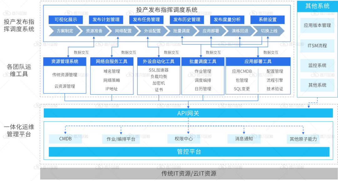 基于统一的运维管理平台,构建银行一体化的投产发布指挥调度中心,实现投产发布的计划、任务、数据、执行、协作的统一管理。